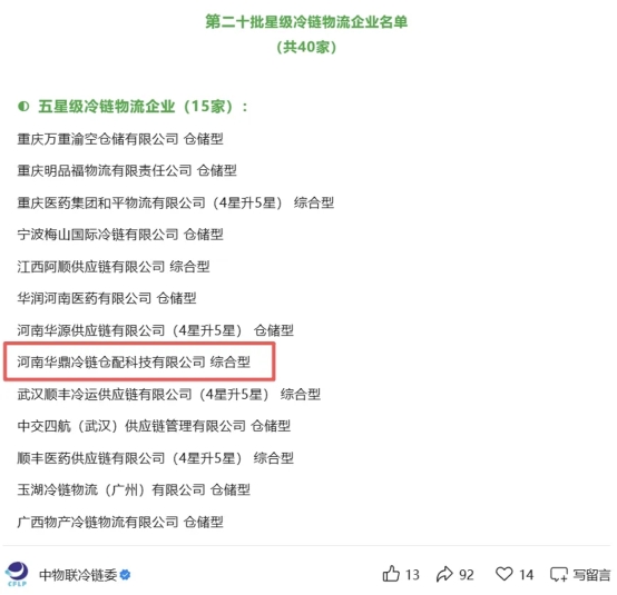 近日,河南华鼎冷链仓配科技有限公司顺利通过由中国物流与采购联合会组织的星级冷链评估,正式获评五星级冷链物流企业(综合型) ,标志着华鼎冷链科技在冷链物流服务领域的“专业化、规范化、科学化”运营管理综合实力获得行业权威认证。