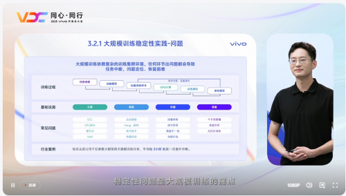 vivo Al工程架构师刘东阳则表示,VTraining训练平台是在容器能力之上构建,支撑vivo手机的蓝心小V等核心产品的大模型训练业务。在大规模训练稳定性实践中,通过减少基础设施高频故障、完善任务故障处置流程两大措施,成功实现了机器每日故障率从2%降低到1‰的突破,千卡任务有效训练时长从60%提升到99%,达到行业一流水平。另外,平台在GPU利用率提升实践中,通过低优任务、训推潮汐部署、GPU虚拟化等策略,深度适配差异化业务场景,实现了资源的高效复用。